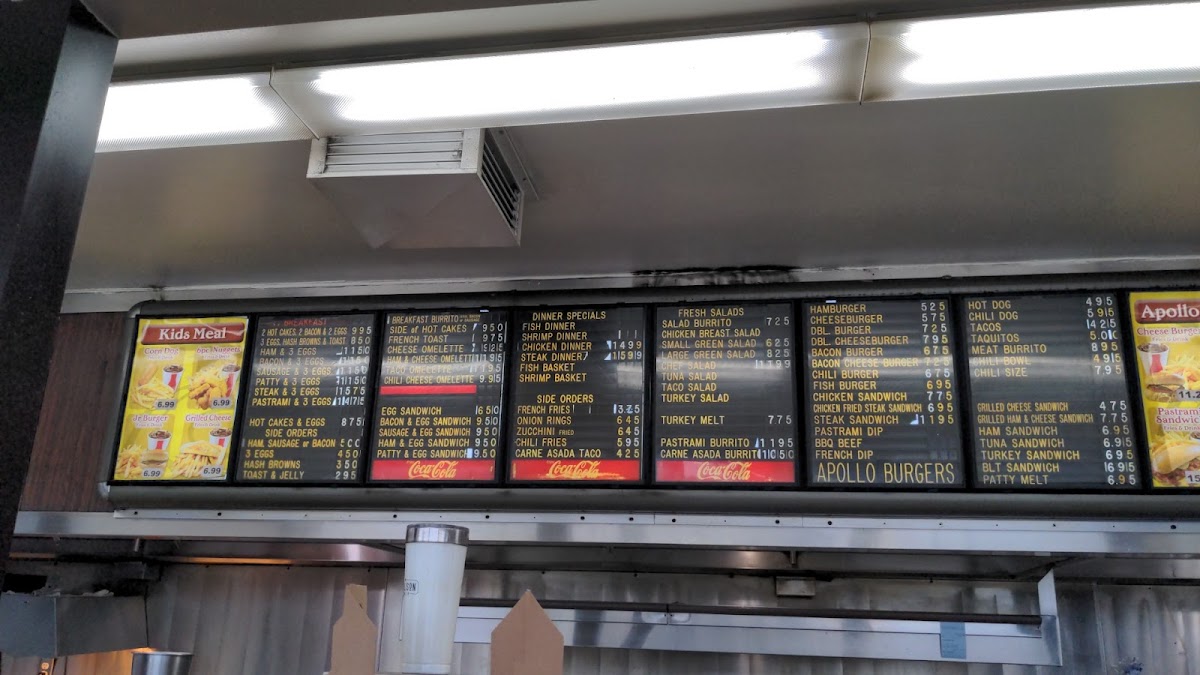 - Other Entrées: Additional menu items include chili dogs, tacos, taquitos, chicken fried steak sandwich, steak sandwich, pastrami dip, BBQ beef, and French dip sandwiches.